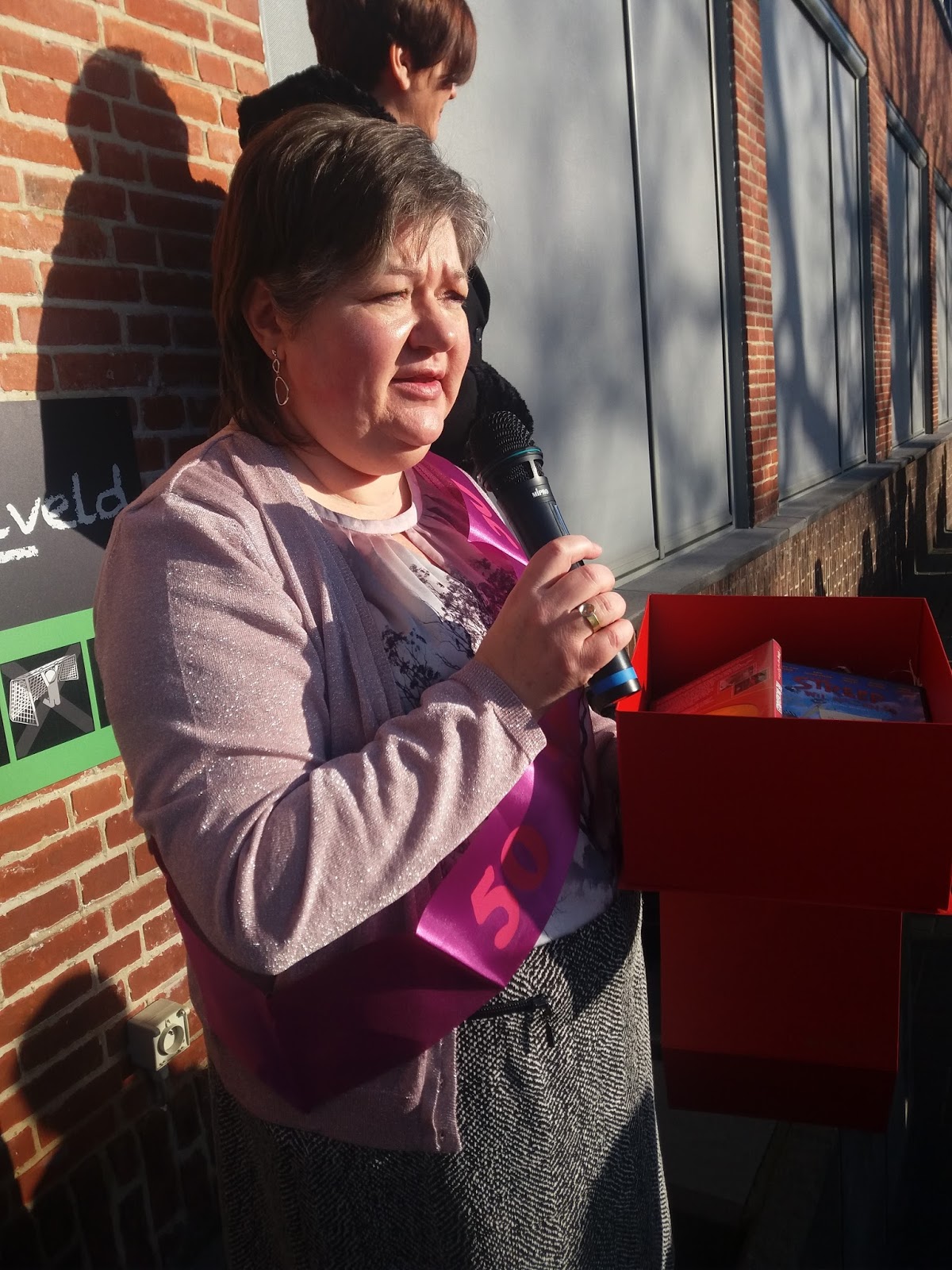 Groot feest vandaag op school! Juf Ariane verjaarde! Ze mocht wel 50 kaarsjes uitblazen. Wie wil, mag haar vanaf nu ook "juf Sarah" noemen :-)