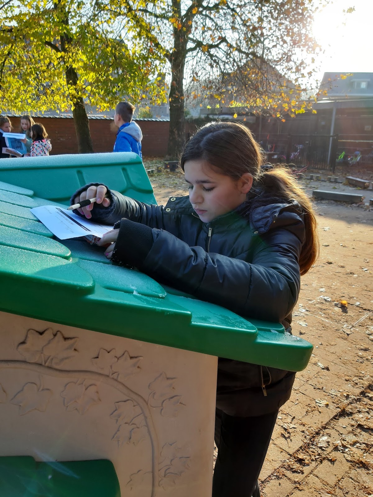 Omdat bewegen héél belangrijk is (en omdat we dat véél te weinig doen), speelden we vandaag weer een renspel. Op de kleuterspeelplaats hingen verspreid Franse woordkaarten omhoog (weliswaar nog te ontcijferen). Per duo probeerden we die code te kraken door zoveel mogelijk woorden juist door te zeggen aan onze duopartner. Lopen, ontcijferen, onthouden en schrijven dus. Niet gemakkelijk! Maar... wel gelukt!